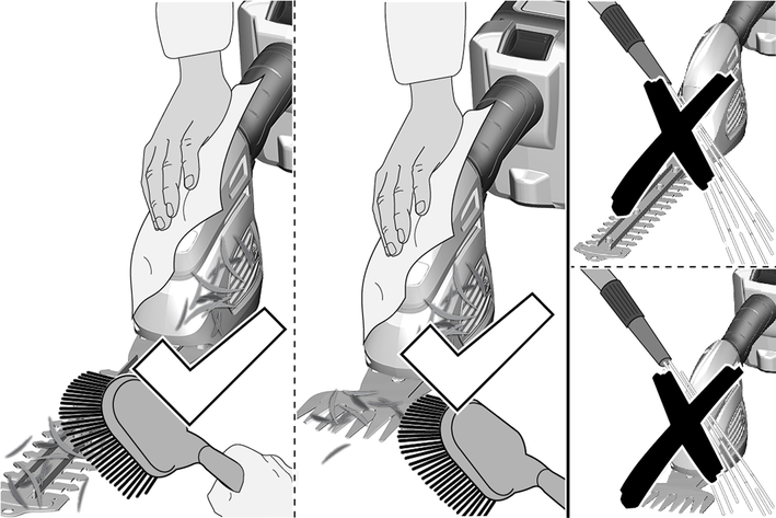 f) Wenn Sie eingeklemmtes Material entfernen oder die Heckenschere warten, vergewissern Sie sich, dass alle Stromschalter ausgeschaltet sind und der Akku entfernt oder abgeklemmt wurde. Unerwartetes Betätigen der Heckenschere beim Beseitigen von eingeklemmtem Material oder bei Wartungsarbeiten kann zu schweren Verletzungen führen.
