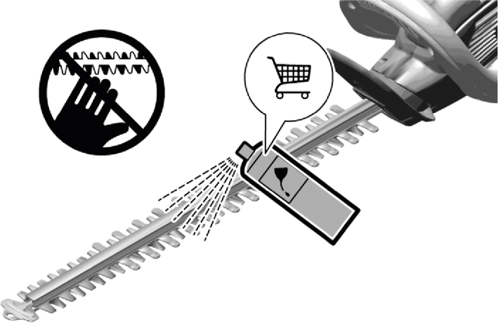 Entfernen Sie nach jeder Verwendung den Schmutz mit einer harten Bürste von den Schneidwerkzeugen und tragen Sie zum Rostschutz ein geeignetes Öl auf, bevor Sie den Messerschutz wieder anbringen. Der Hersteller empfiehlt als Rostschutz und zum Ölen ein Spray zu verwenden. Fragen Sie Ihren Kundendienst nach einem geeigneten Spray. Sie können die Schneidwerkzeuge vor jeder Benutzung auf die beschriebene Weise ölen.