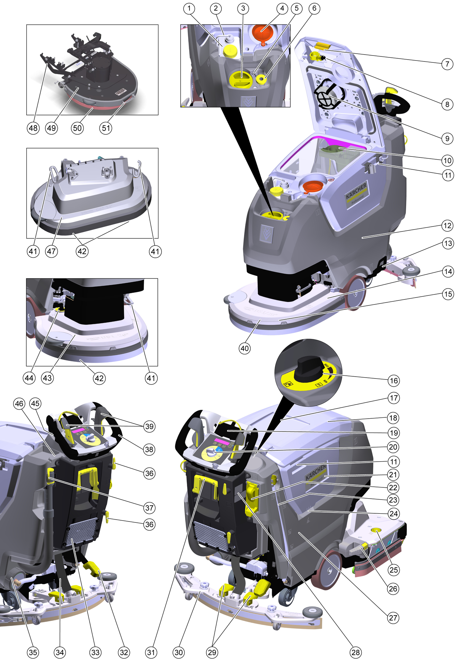 Für die Bedienung oder Wartung durch den Benutzer vorgesehene Gerätebauteile sind gelb markiert.