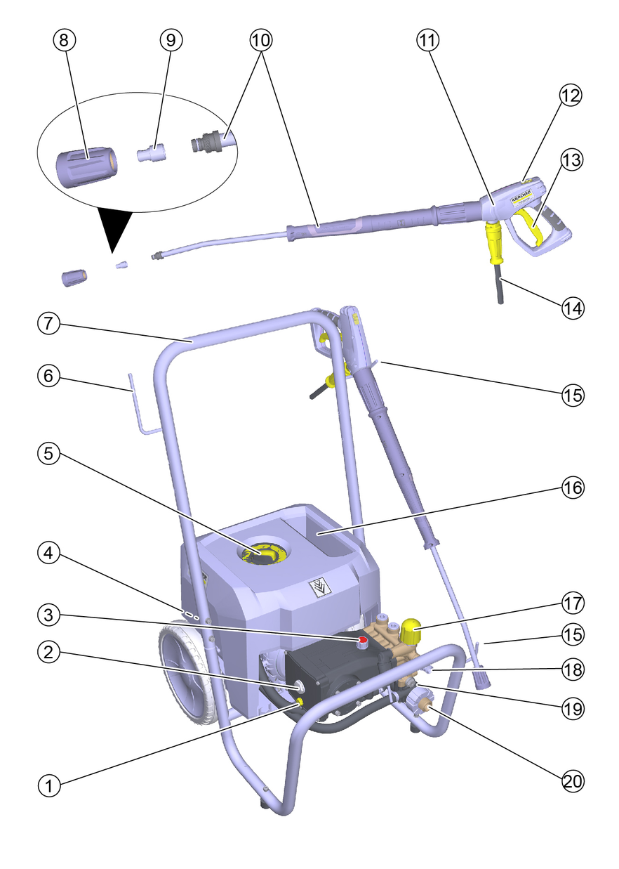 When the trigger on the high-pressure gun is released, the pressure switch switches off the high-pressure pump and the high-pressure jet stops.