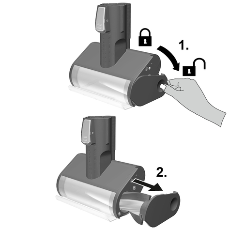 Odjistěte kryt / držák kartáčového válce pomocí mince nebo jiného předmětu a sejměte jej.