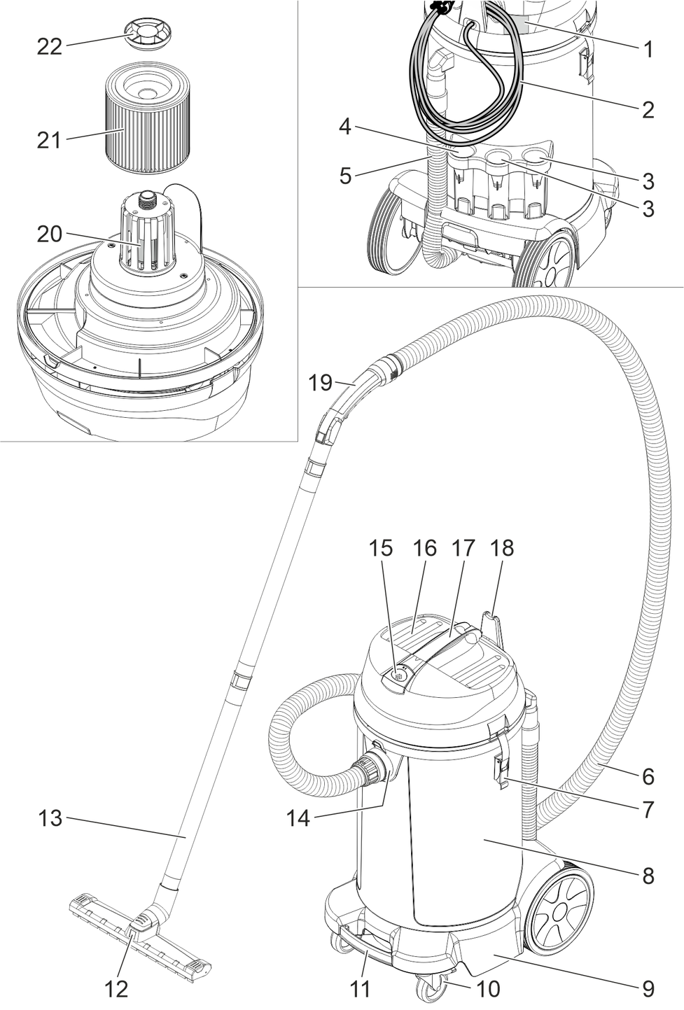 Antes de retirar la cubierta, realizar los trabajos de mantenimiento y durante la inactividad, DESCONECTOR LA ASPIRADORA DEL CIRCUITO PRINCIPAL.