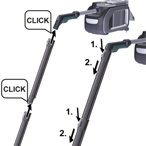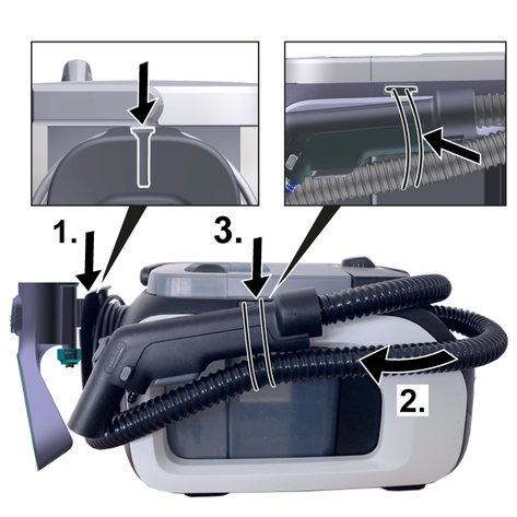 Kiinnitä suihkuimuletkun kahva/letku kuminauhan avulla laitteen sivulla olevaan varustepidikkeeseen. Kiinnitä tässä huomiota oikeaan kelaussuuntaan, jotta kahva tai letku voidaan kiinnittää kuminauhalla.