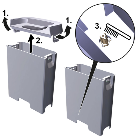 Siivoustyön päätteeksi: Säilytä laitetta "kuivausasennossa" (molemmat säiliön kannet ovat hieman auki, jolloin jäljellä oleva neste voi kuivua jäämiä jättämättä).