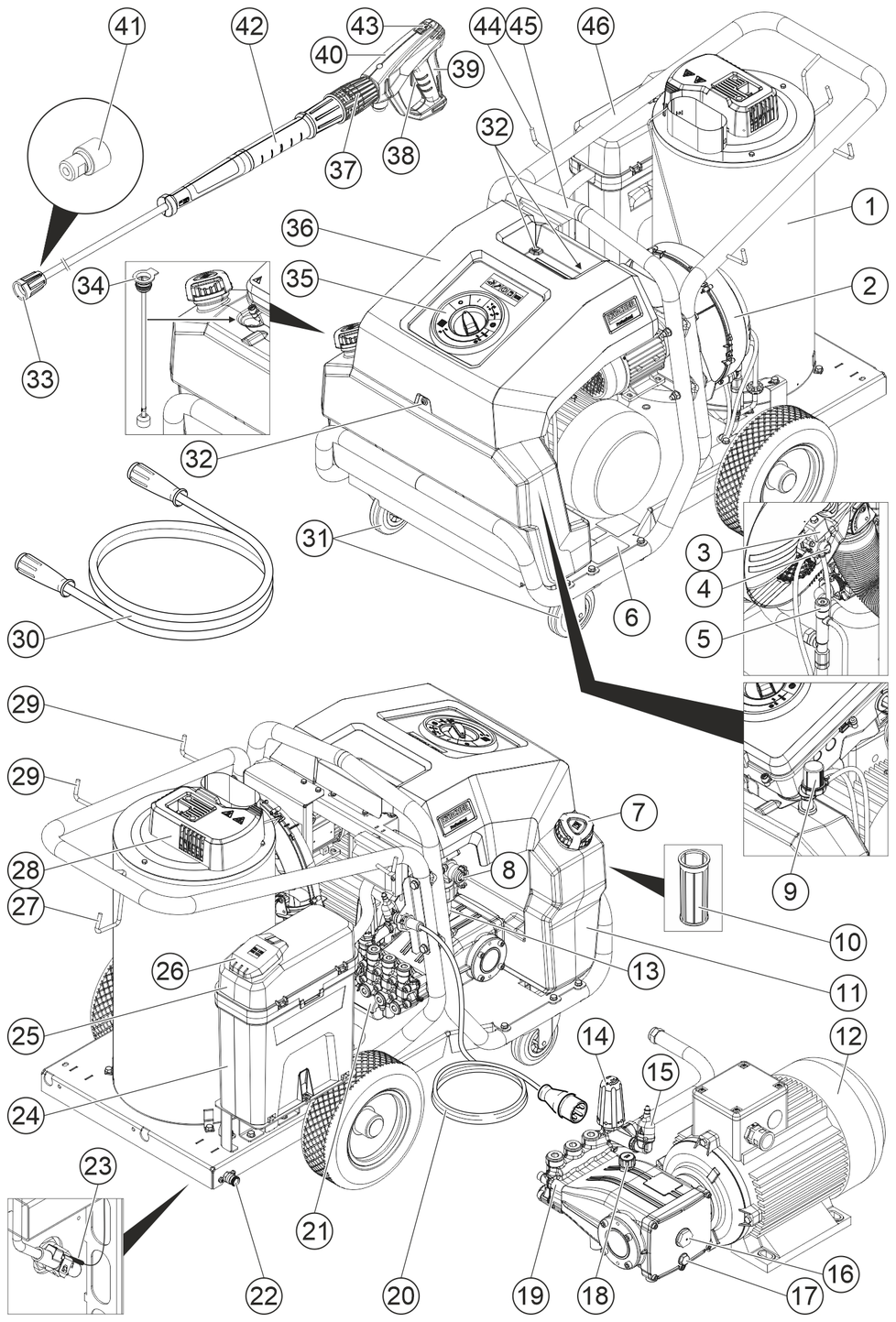 | Den Hochdruckstrahl nicht auf Personen, Tiere, aktive elektrische Ausrüstung oder auf das Gerät selbst richten. Das Gerät vor Frost schützen. |