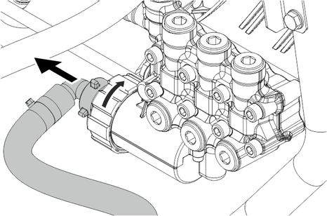 Beim Reduzieren der Wassermenge am Pumpenkopf oder mit der Druck-/Mengenregulierung an der Hochdruckpistole öffnet das Überströmventil und ein Teil des Wassers fließt zur Pumpensaugseite zurück.