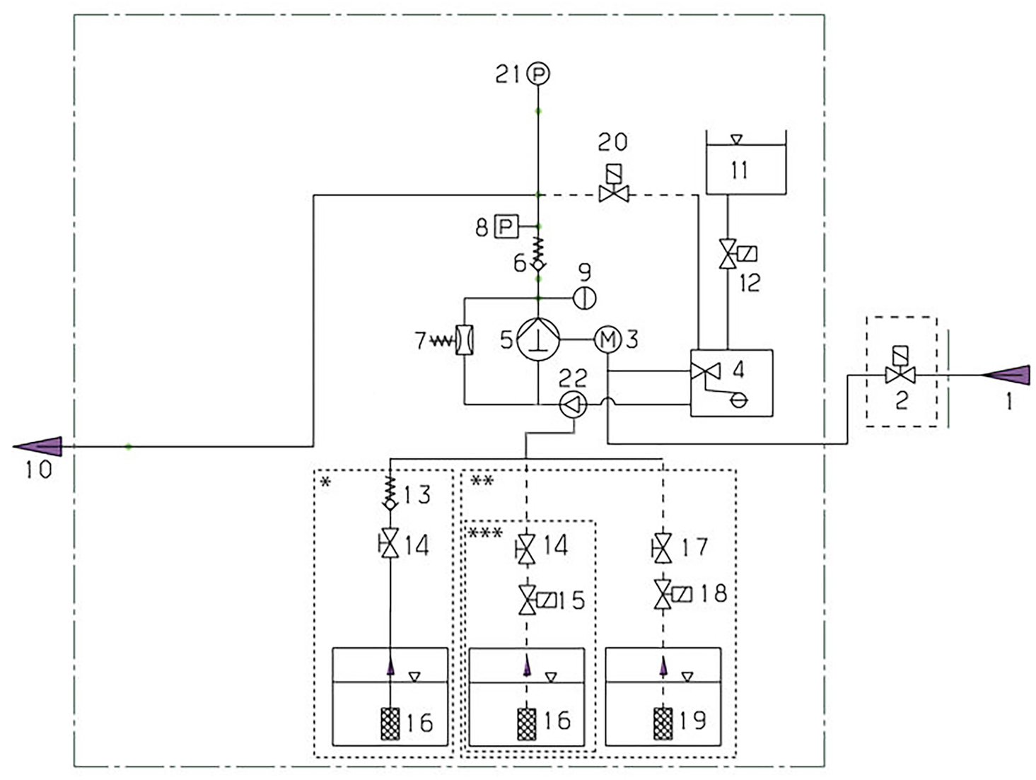 Die Anlage fördert Wasser unter hohem Druck zu nachgeschalteten Hochdruck-Reinigungseinrichtungen. Bei Bedarf wird Reinigungsmittel angesaugt und dem Wasser beigemischt.