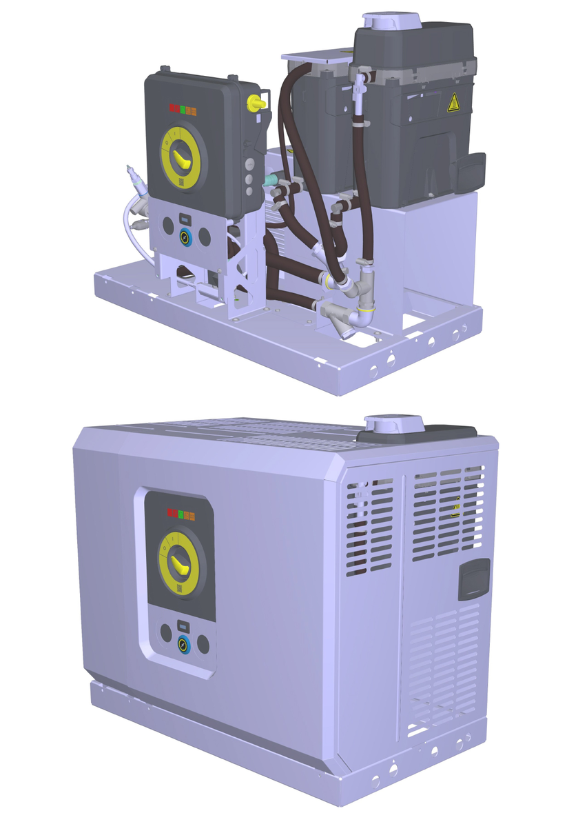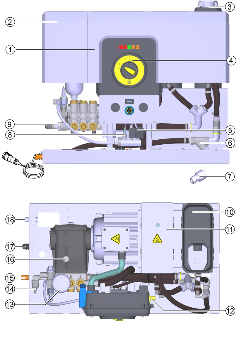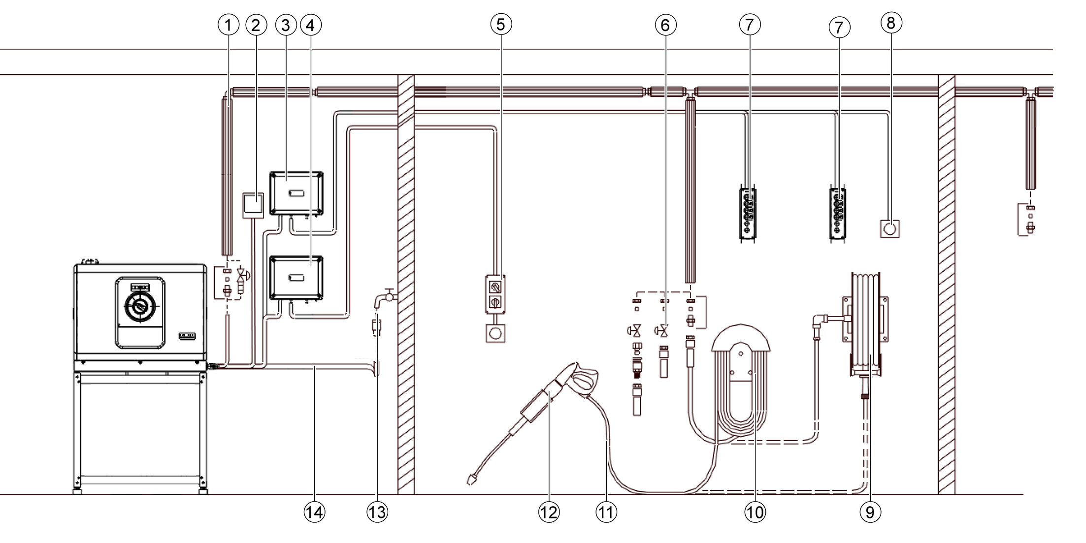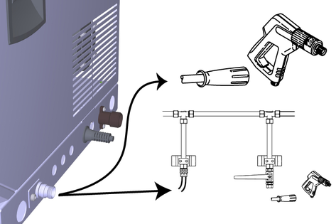 Anläggningen installeras fast i ett torrt, frostfritt utrymme. Högtrycksvattnet fördels via ett fast installerat rörnät. Alternativt kan ett spolhandtag med en högtrycksslang anslutas direkt till maskinens högtrycksutgång.