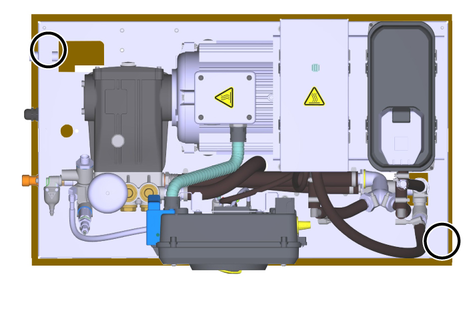 Ta bort de 2 skruvarna höger fram och vänster bak för att lossa maskinramen från pallen.