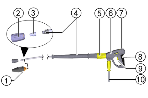 ![]() | Rikta inte högtrycksstrålen mot personer, djur, aktiv elektrisk utrustning eller mot själva maskinen. Skydda maskinen mot frost. |