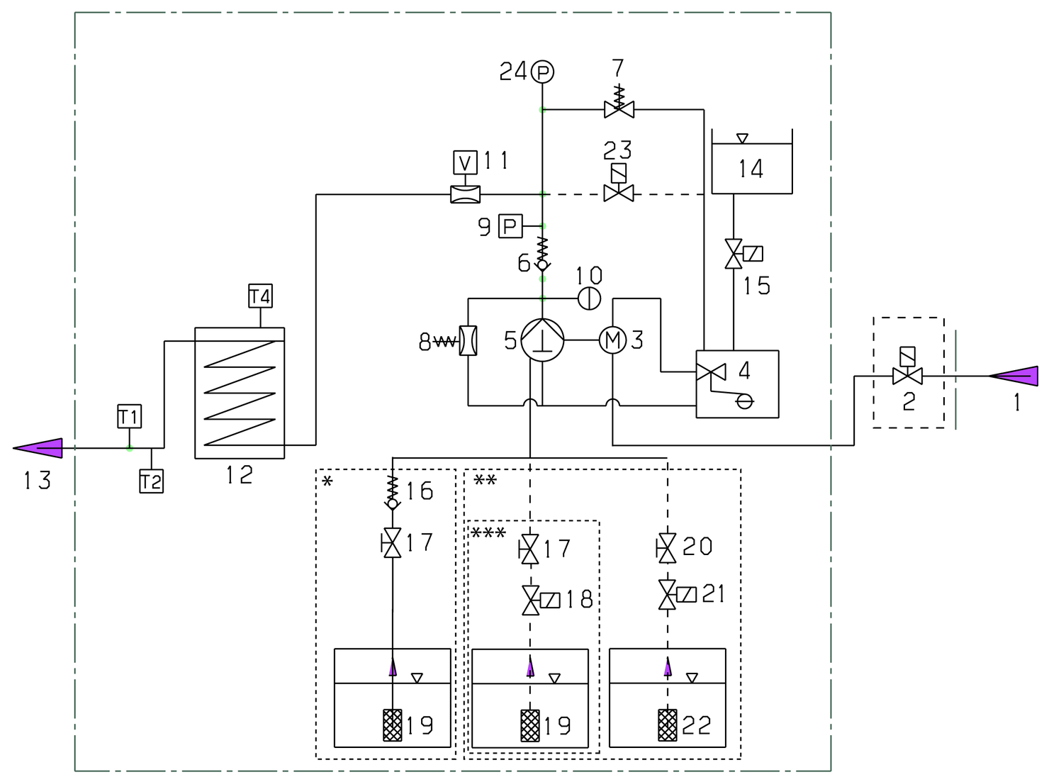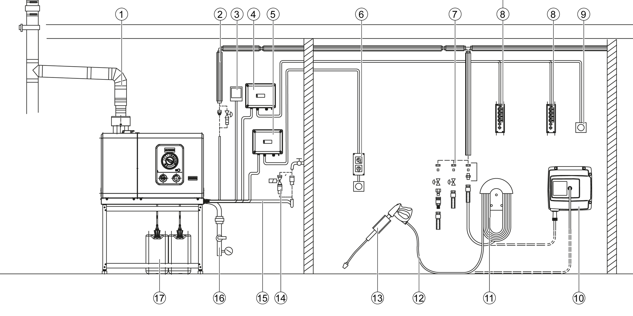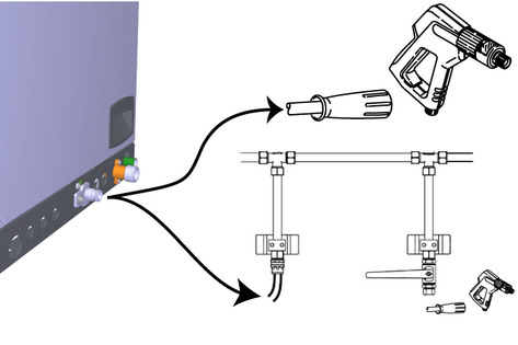 Weitere Arbeitsplätze sind je nach Anlagenaufbau an den Zubehörgeräten (Spritzeinrichtungen), die an den Zapfstellen angeschlossen werden. An diesen Arbeitsplätzen können optional Fernbedienungen installiert werden.