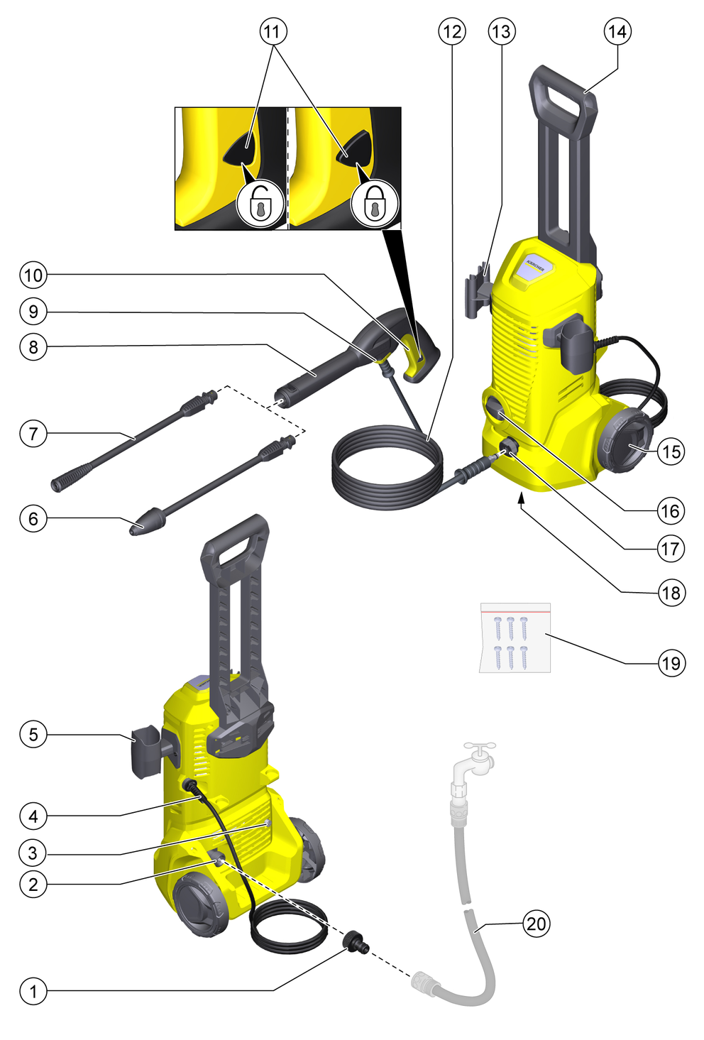 ![]() | Nesměřujte vysokotlaký paprsek na osoby, zvířata, aktivní elektrická zařízení nebo na přístroj samotný. Přístroj chraňte před mrazem. |