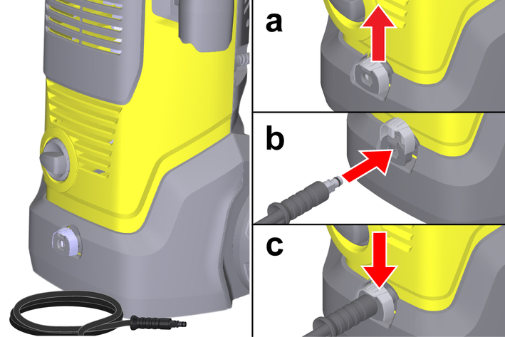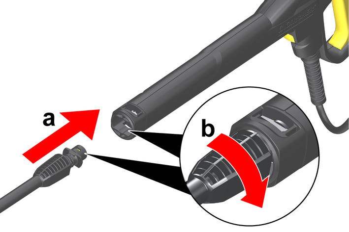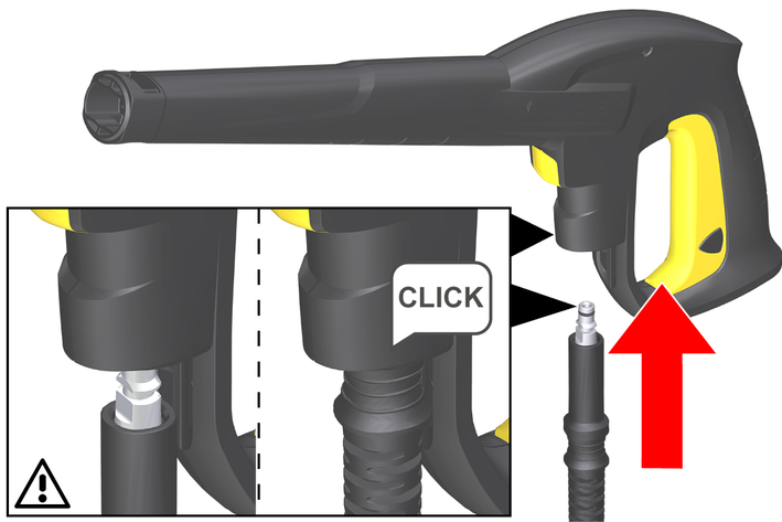 Stick in högtrycksslangen i spolhandtaget tills den hakar fast med ett hörbart klick.