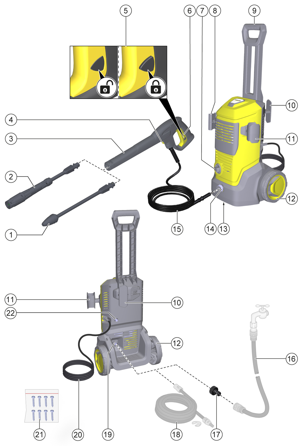 ![]() | Rikta inte högtrycksstrålen mot personer, djur, aktiv elektrisk utrustning eller mot själva maskinen. Skydda maskinen mot frost. |