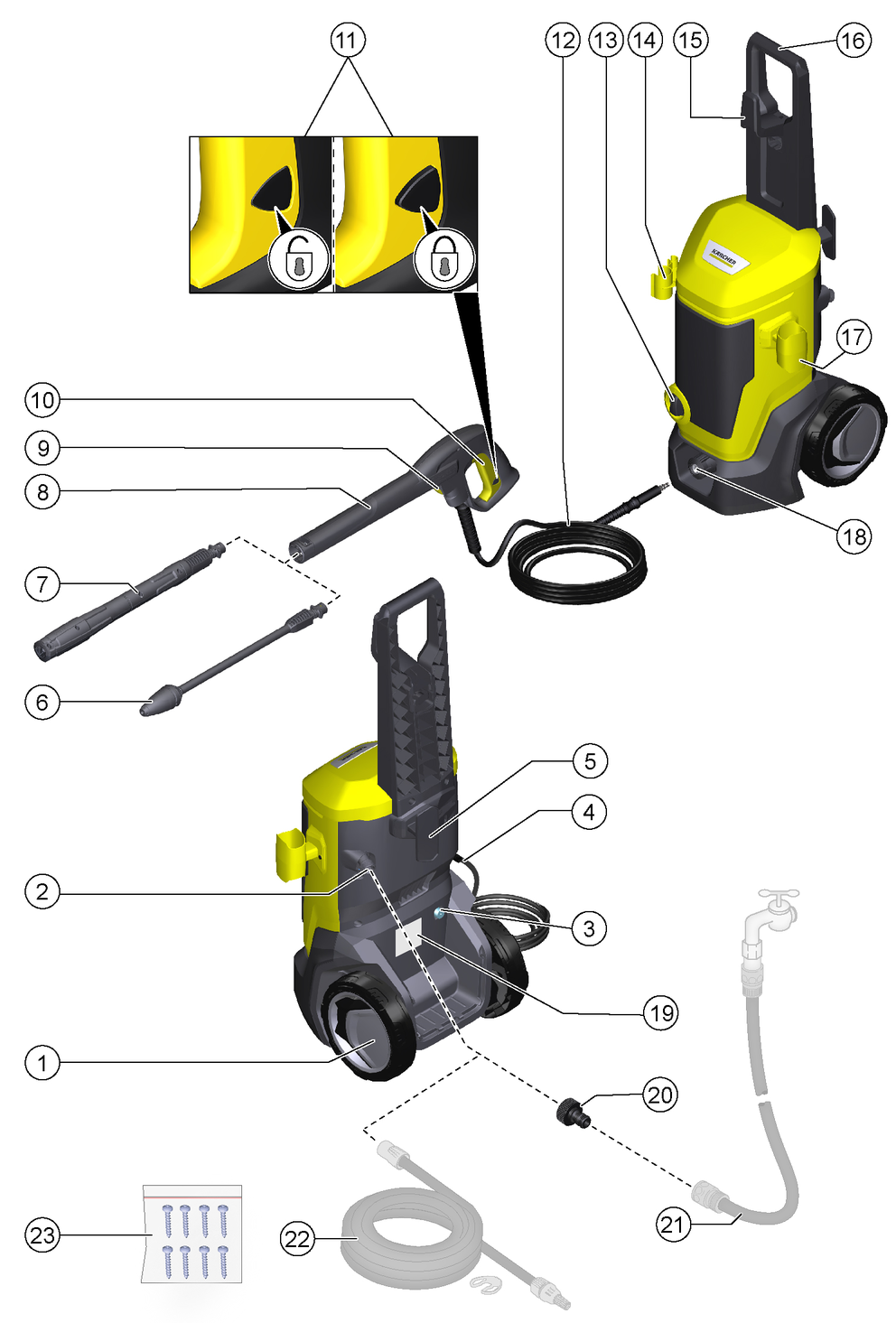 ![]() | Rikta inte högtrycksstrålen mot personer, djur, aktiv elektrisk utrustning eller mot själva maskinen. Skydda maskinen mot frost. |