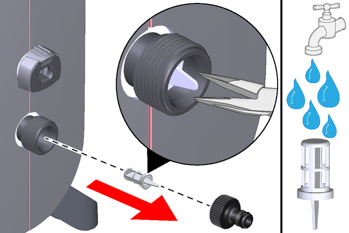 Screw the suction hose onto the water connection of the device and hang it in a water source (e.g. rain barrel).