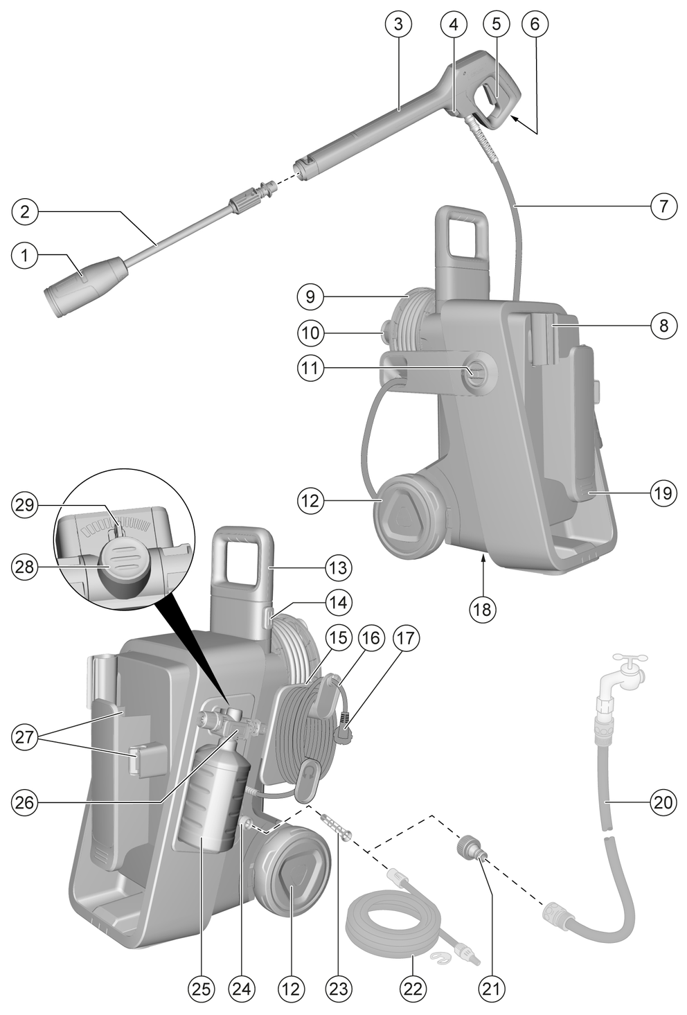 ![]() | Ne irányítsa a magasnyomású sugarat emberekre, állatokra, működő elektromos berendezésekre vagy közvetlenül a készülékre. Óvja a készüléket a fagytól. |