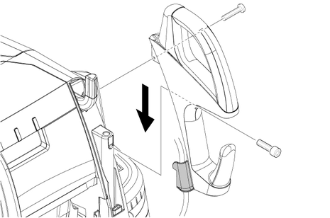 電源ケーブルをハンドルのケーブルガイドに引っ掛ける際は、ケーブルが損傷していないことを確認してください。ネジの締め付けトルク (6.5~7.0 Nm) に注意し、ハンドルを取り付けます。