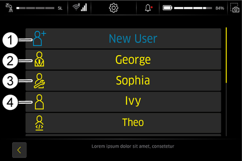 Jedem Benutzer können über den Touchscreen des Geräts Berechtigungen für verschiedene Gerätefunktionen erteilt oder verweigert werden.