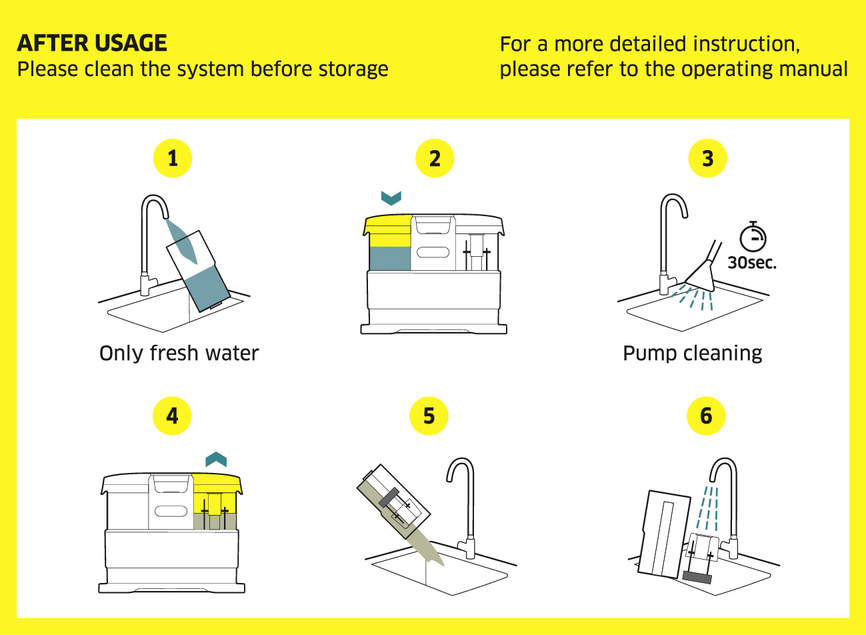 To clean the system, switch on the device and activate the spray nozzle for 30 seconds.
