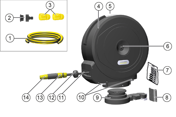 Die Schlauchbox und den Schlauch bei Lagerung im Freien gelegentlich mit einem feuchten Tuch abwischen.