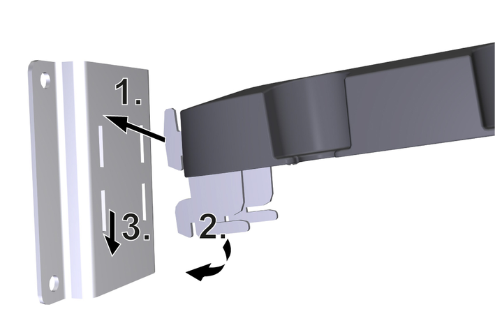 Die Wandhalterung einschwenken, sodass die unteren beiden Haken in die unteren Schlitze der Fixierplatte eingeführt sind.