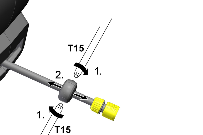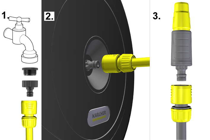 Die Spritze oder andere KÄRCHER Bewässerungs-Zubehöre an die Schlauchkupplung des Wasserschlauchs anstecken.