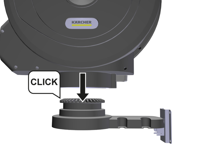 Festen Sitz der Schlauchbox prüfen.Die Schlauchbox auf die Wandhalterung setzen. Die Schlauchbox arretiert sich von selbst.