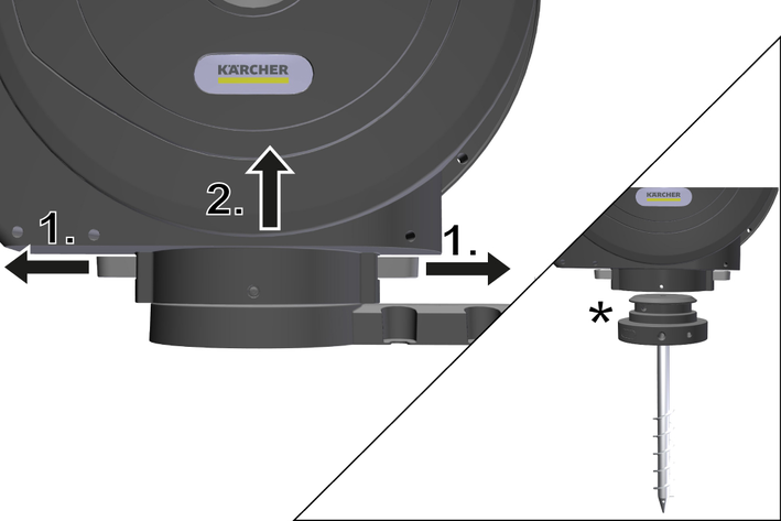 Die Schlauchbox nicht aufsetzen, wenn die Wandhalterung zur Aufbewahrung senkrecht an der Wandhalterung eingehängt ist!Zur platzsparenden Aufbewahrung kann die Wandhalterung abgenommen und von oben an der Fixierplatte eingehängt werden.