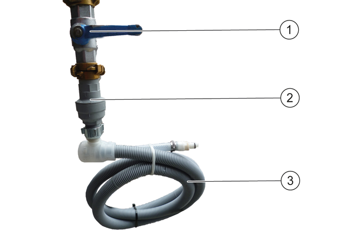 To ensure that no water overflows at the docking station, a water stop valve can also be installed. The water stop valve is mounted between the tap and the Aquastop hose.