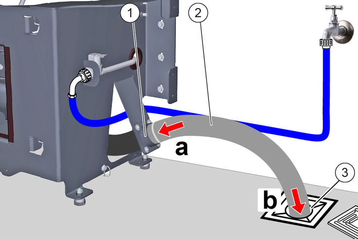 Use suitable pipes, hoses, seals and fasteners for the connection, depending on local conditions (shown as an example with waste water hose).