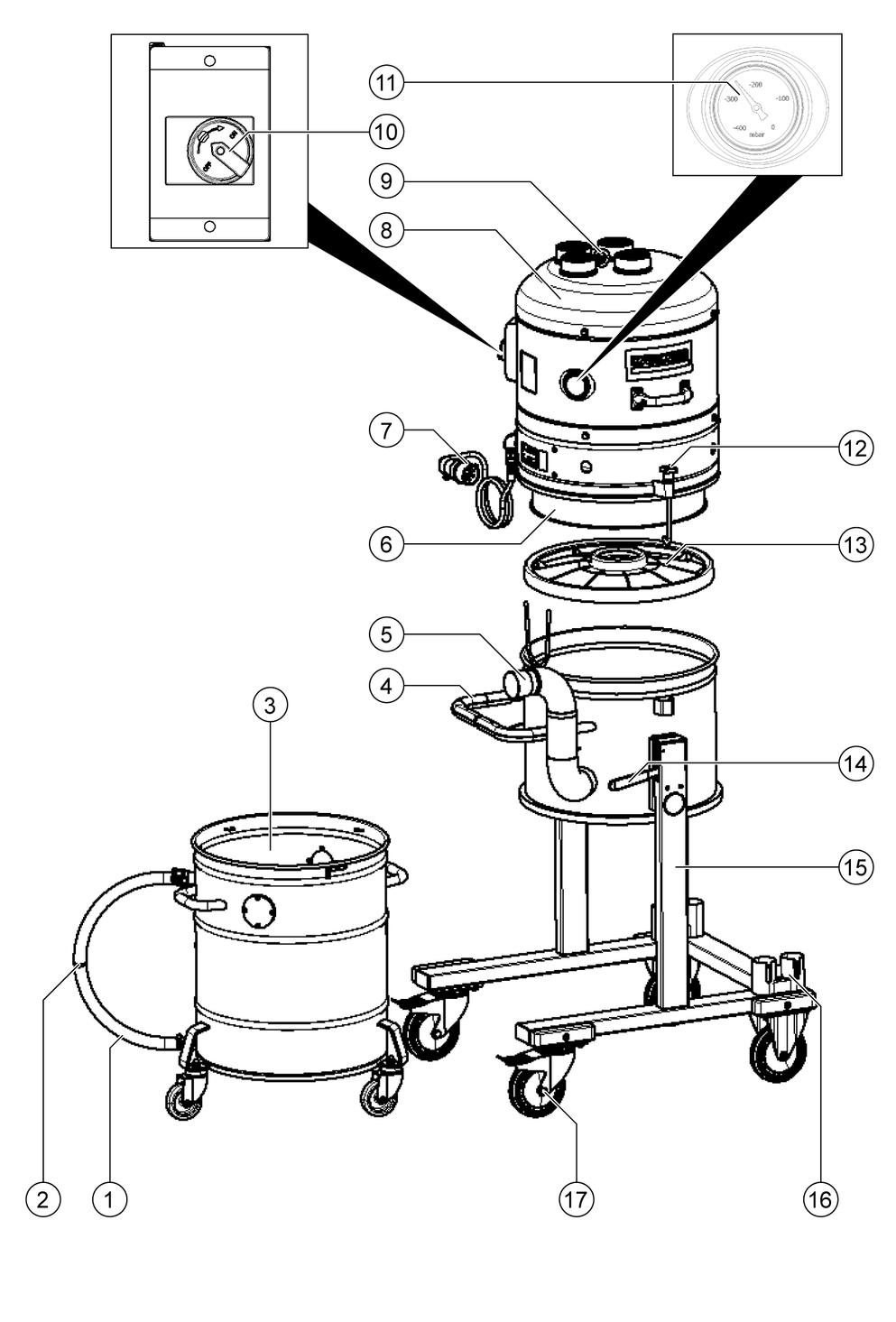 Peligro de aplastamiento. Utilice guantes cuando retire o coloque el cabezal de aspiración, la unidad filtrante o el recipiente colector.