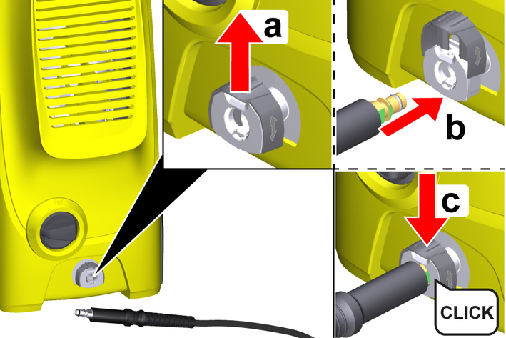 Dugja be a magasnyomású tömlőt a magasnyomású pisztolyba, amíg hallhatóan bekattan.