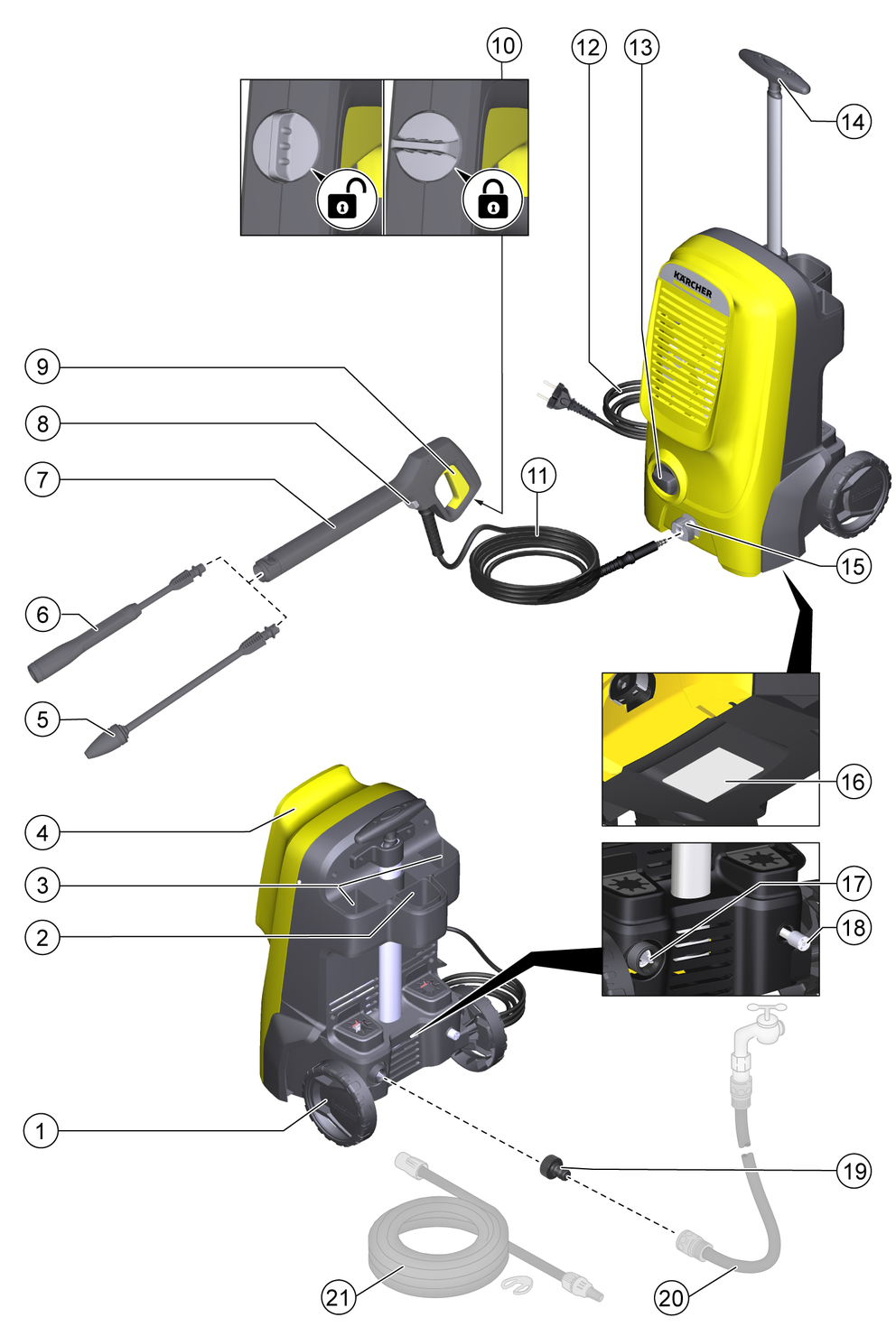 ![]() | Ne irányítsa a magasnyomású sugarat emberekre, állatokra, működő elektromos berendezésekre vagy közvetlenül a készülékre. Óvja a készüléket a fagytól. |