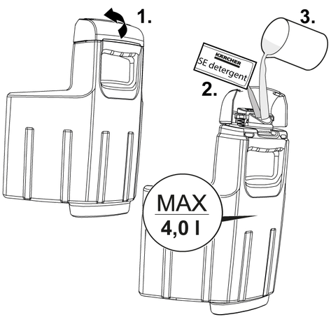 Avhengig av graden av forurensning, kan mengden også reduseres. Rengjøringsmiddelet tilsettes i ferskvannstanken, fyll opp med vann fra springen, ikke overfyll.