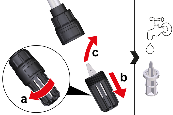 请仅用流动的清水逆着水流方向冲洗精细过滤器。请勿使用尖锐或坚硬物体(如针具、钢丝刷 等)进行清洁。拆卸精细过滤器: