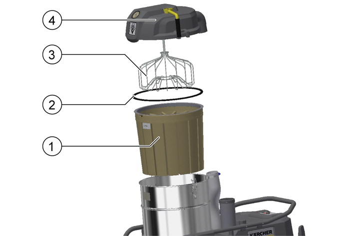湿式吸尘时,请勿使用垃圾袋。如要确保设备无尘清空,可以将一个垃圾袋放入抽吸物质容器中。请勿使用垃圾袋进行湿式吸尘!