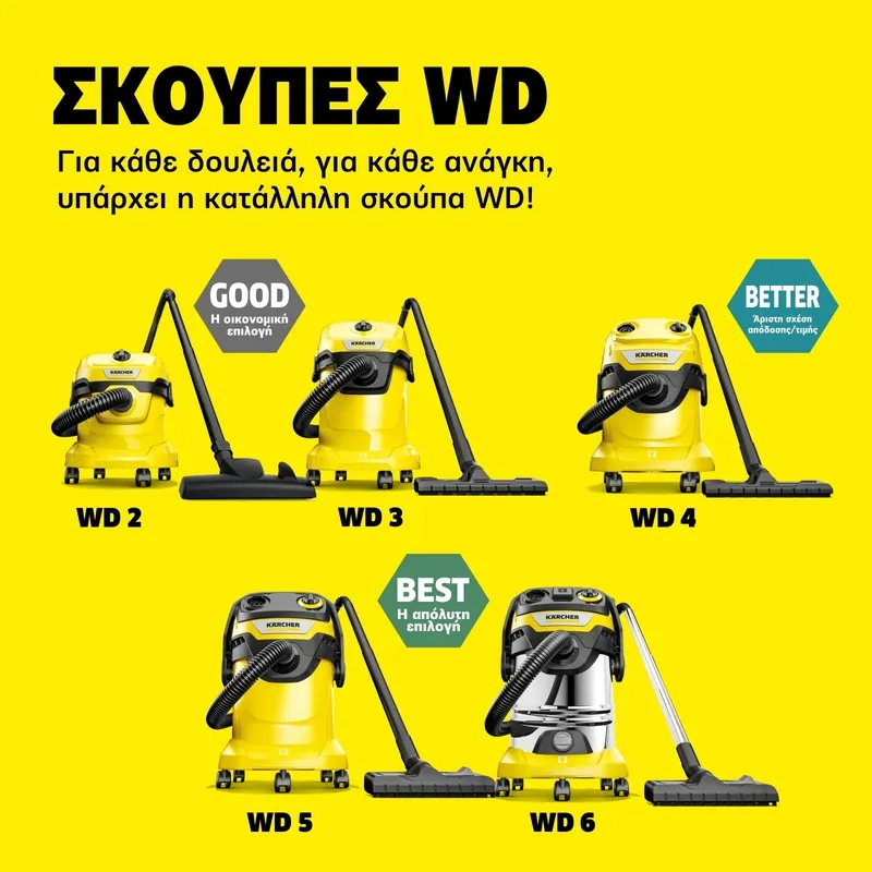 Είτε πρόκειται για ξηρούς ή υγρούς ρύπους, χονδροειδείς ή όχι- στο αυτοκίνητο, στο υπόγειο, στο γκαράζ, στο εργαστήριο ή γύρω από το σπίτι- οι σκούπες ξηρής και υγρής αναρρόφησης της Kärcher θα σε εκπλήξουν με την πολύ-λειτουργικότητά τους. Είναι εξαιρετικά συμπαγείς, έχουν εξαιρετική απορροφητική ισχύ και ενεργειακή απόδοση. Χάρη στον συμπαγή σχεδιασμό τους μπορούν να αποθηκευτούν εύκολα σχεδόν παντού και είναι συνεχώς κοντά για να τις χρησιμοποιήσεις. Οι πολυάριθμες λειτουργίες και η μεγάλη γκάμα αξεσουάρ εξασφαλίζουν τέλεια αποτελέσματα καθαρισμού και μέγιστη ευκολία στην χρήση. Οι μπαταριοκίνητες μηχανές μας μπορούν επίσης να χρησιμοποιηθούν όπου δεν υπάρχουν διαθέσιμες πρίζες.