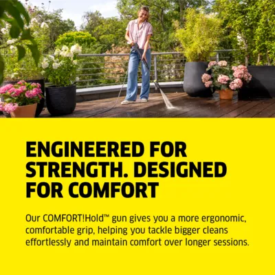 At Kärcher, we believe that cutting-edge technology should not only deliver exceptional performance, but also provide an unmatched level of cleaning comfort. That’s why our pressure washers feature a range of innovative enhancements designed to make your work easier, faster, and more enjoyable. One example is the COMFORT!Hold™ trigger gun, which offers improved handling and ergonomics—even during extended cleaning tasks*.
