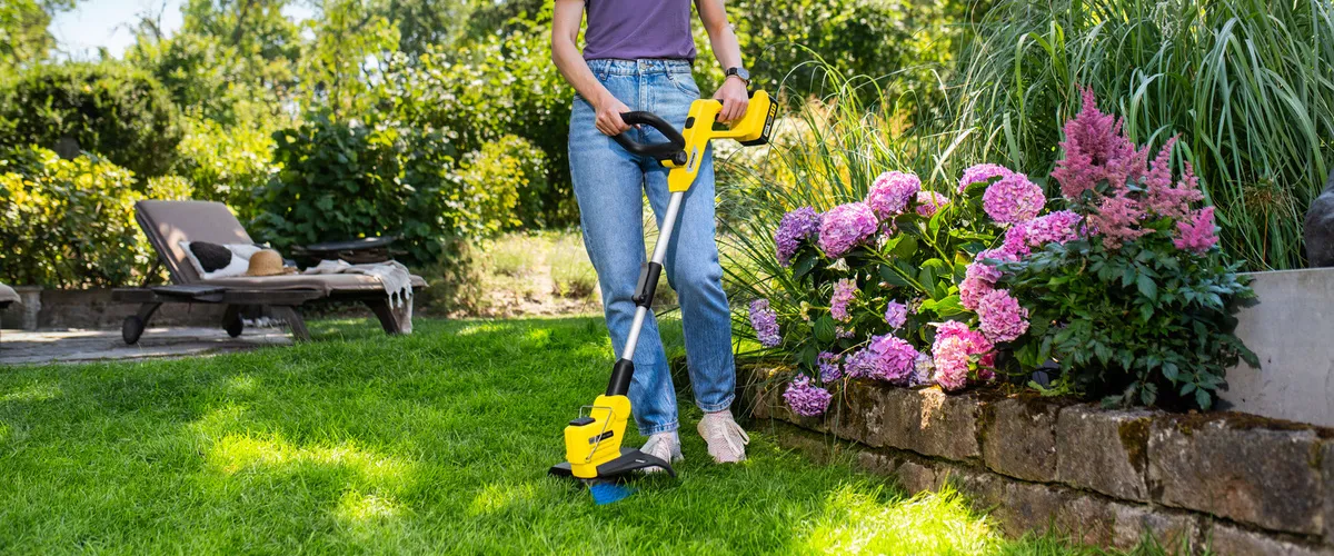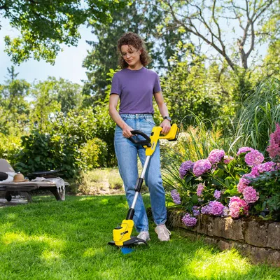 Battery lawn trimmers by Kärcher are real all-rounders in the garden. Not only do they produce a clean cut at the edge of the lawn, but they are also particularly good at reaching corners and tight spots. The ergonomic handle design of the battery powered lawn trimmer ensures users maintain a comfortable posture that protects their back at all times.