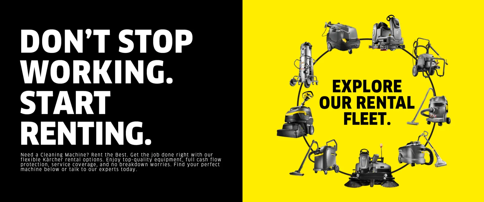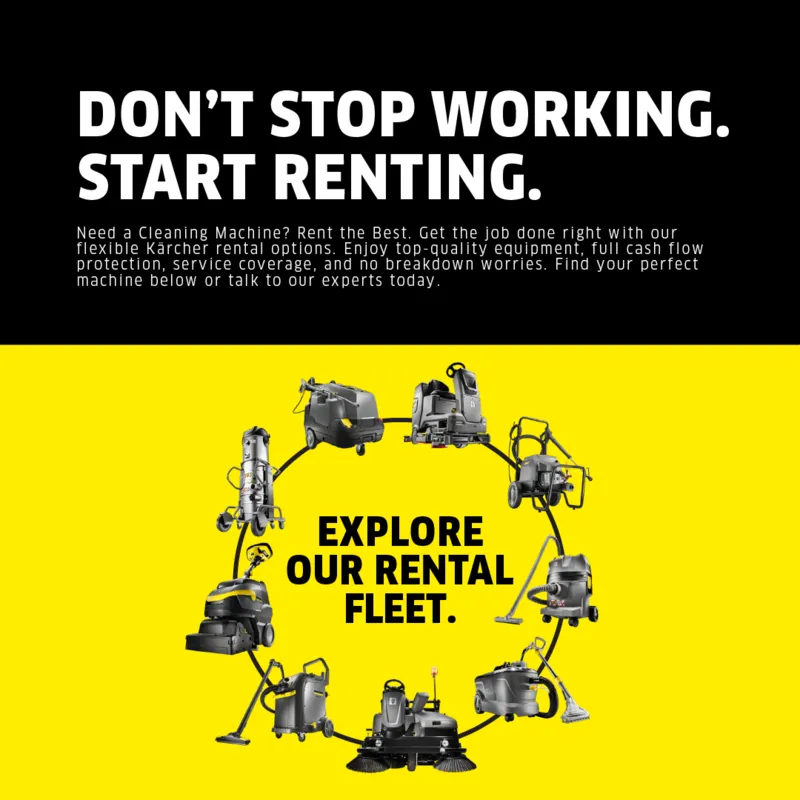Need a Cleaning Machine? Rent the Best. Get the job done right with our flexible Kärcher rental options. Enjoy top-quality equipment, full cash flow protection, service coverage, and no breakdown worries. Find your perfect machine below or talk to our experts today.